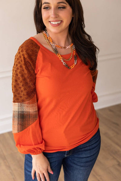 So Confident Orange Plaid & Glitter Sleeve Top: This vibrant top features a bold orange plaid pattern with sparkling glitter sleeves. Perfect for adding a pop of color and a touch of glam to your outfit while staying confident and stylish.