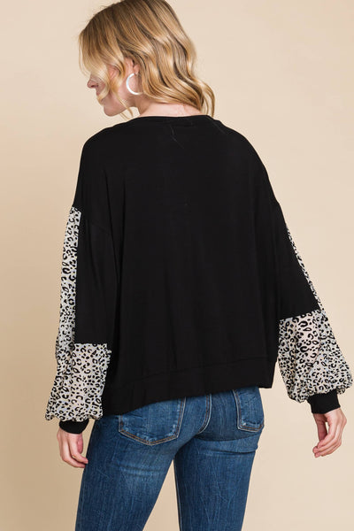 Solid Jersey Casual Top with Balloon Sleeves and Animal Print Mesh Detail 95% Rayon 5% Spandex, 100% Polyester