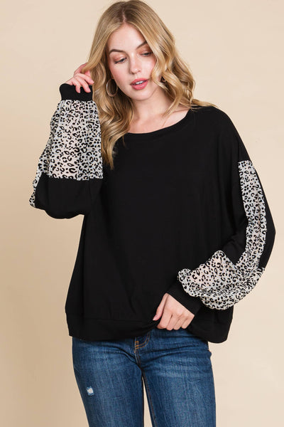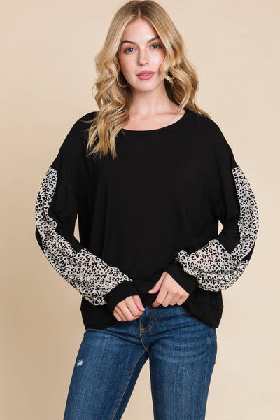 Solid Jersey Casual Top with Balloon Sleeves and Animal Print Mesh Detail 95% Rayon 5% Spandex, 100% Polyester