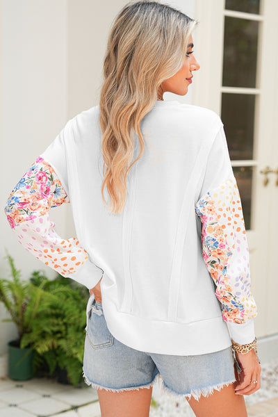 White Floral Dotted Print Patchwork Sleeve High Low Sweatshirt